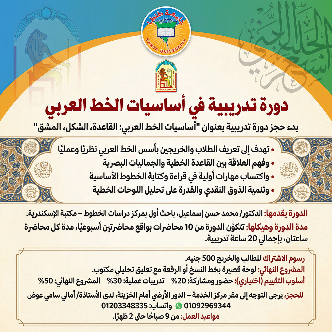 أعلن مركز الخدمة العامة بكلية الآداب – جامعة طنطا، برعاية الأستاذ الدكتور/ أحمد عبادة العربي – عميد الكلية والأستاذ الدكتور/ محمد السيد فياض – مدير مركز الخدمة العامة، عن بدء حجز دورة تدريبية بعنوان “أساسيات الخط العربي: القاعدة، الشكل، المشق”