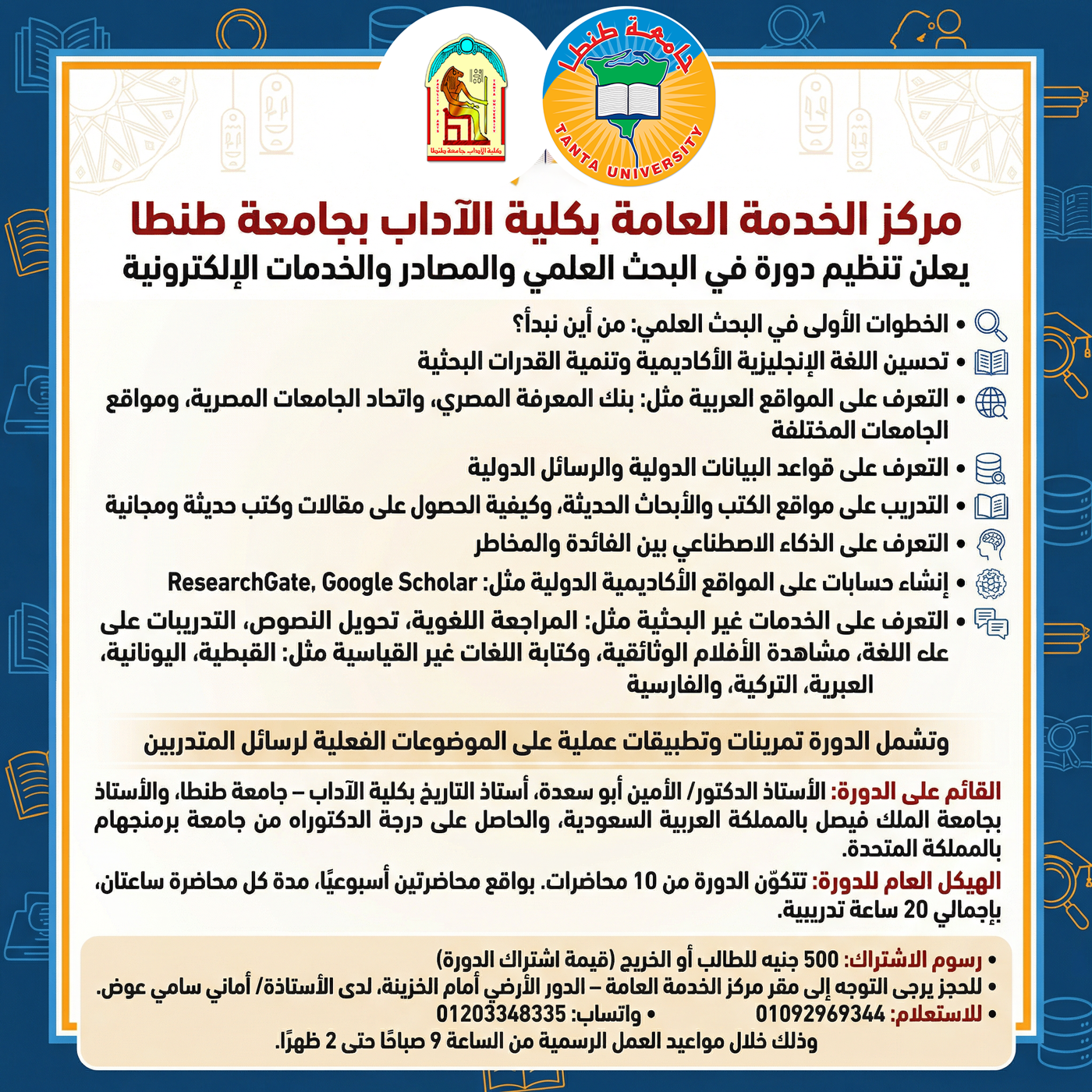 يعلن مركز الخدمة العامة بكلية الآداب – جامعة طنطا عن تنظيم دورة تدريبية بعنوان «البحث العلمي – المصادر والخدمات الإلكترونية»، والتي تهدف إلى تنمية مهارات البحث العلمي لدى الطلاب والخريجين، والتعريف بأهم المصادر وقواعد البيانات الإلكترونية التي تدعم العملية البحثية