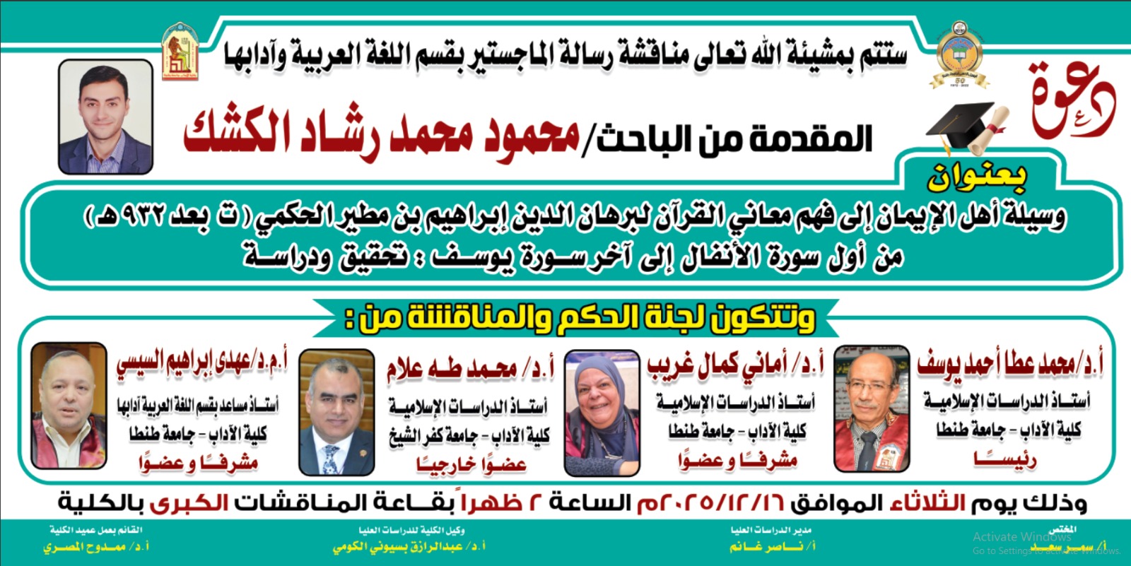 شهدت كلية الآداب بجامعة طنطا مناقشة رسالة الماجستير المقدمة من الباحث "محمود محمد رشاد الكشك" بقسم اللغة العربية، بعنوان "وسيلة اهل الإيمان إلى فهم معاني القرآن لبرهان الدين إبراهيم بن مطير الحكمى من أول سورة الأنفال إلى آخر سورة يوسف": تحقيق ودراسة.