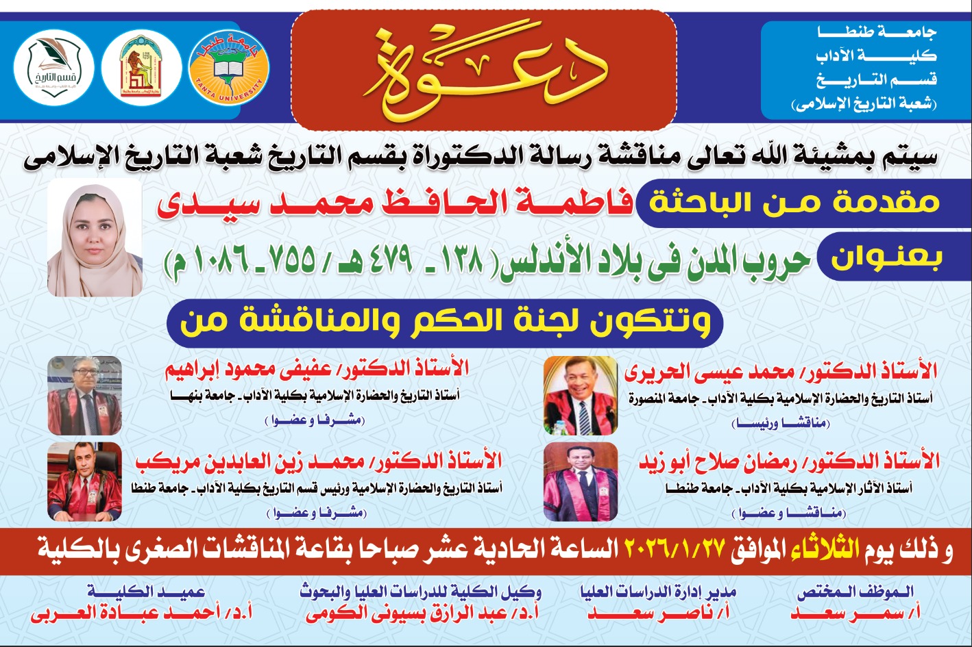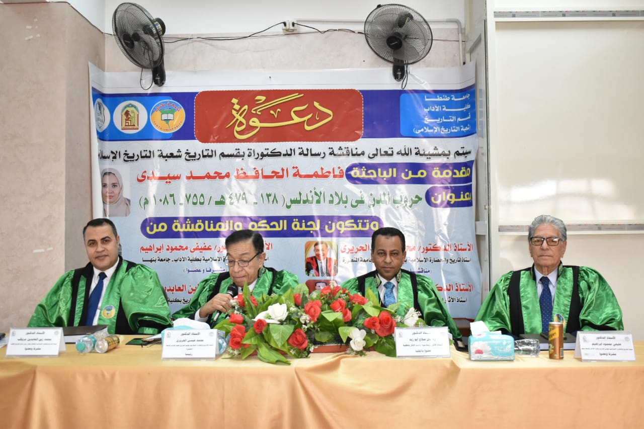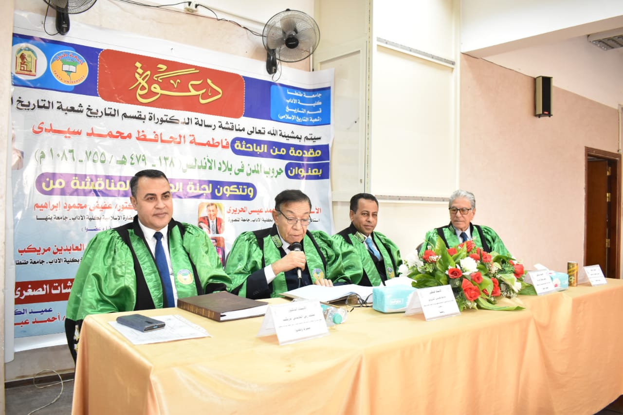 شهدت كلية الآداب بجامعة طنطا مناقشة رسالة الدكتوراة المقدمة من الباحثة "فاطمة الحافظ محمد سيدي" بقسم التاريخ، بعنوان " حروب المدن في بلاد الأندلس ( ١٣٨ - ٤٧٩ ه / ٧٥٥ - ١٠٨٦م) ".