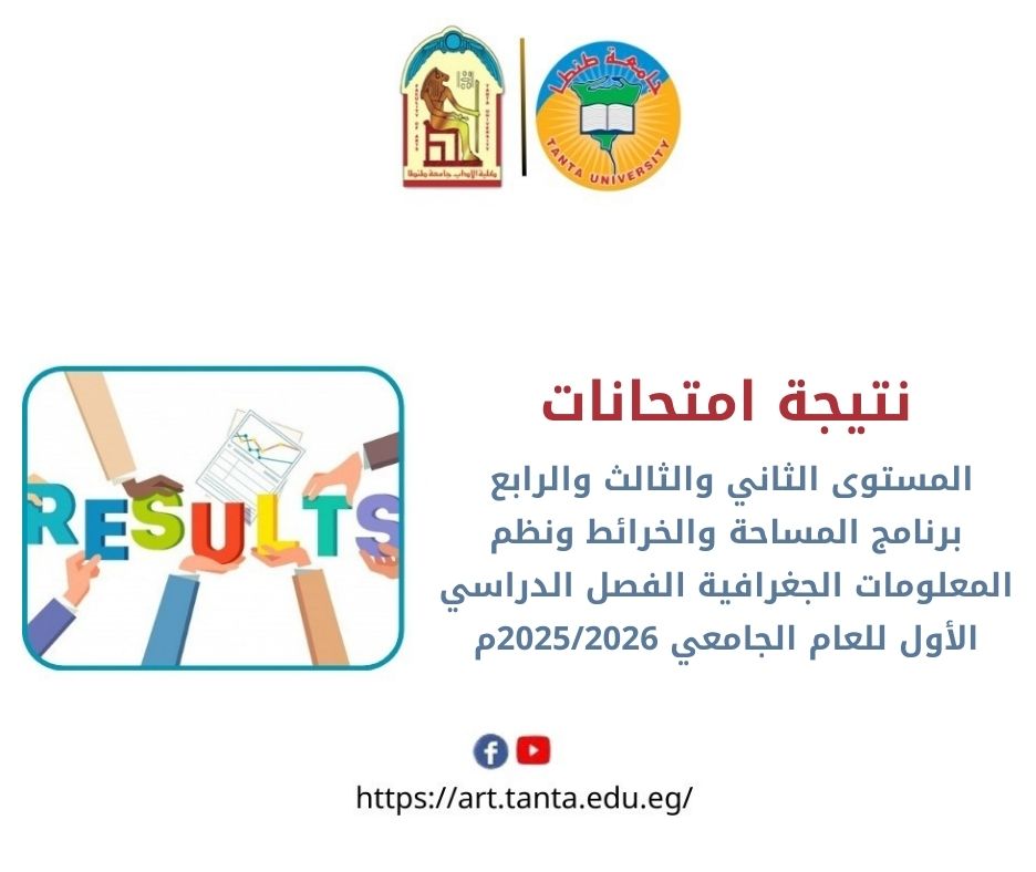 تعلن كلية الآداب بجامعة طنطا عن نتيجة امتحانات المستوى الثاني والثالث والرابع برنامج المساحة والخرائط ونظم المعلومات الجغرافية الفصل الدراسي الأول للعام الجامعي 2025/2026م.