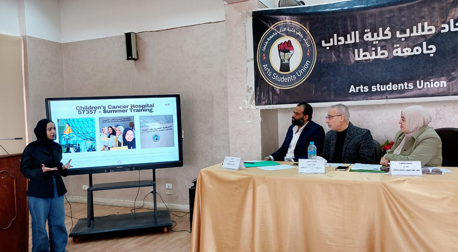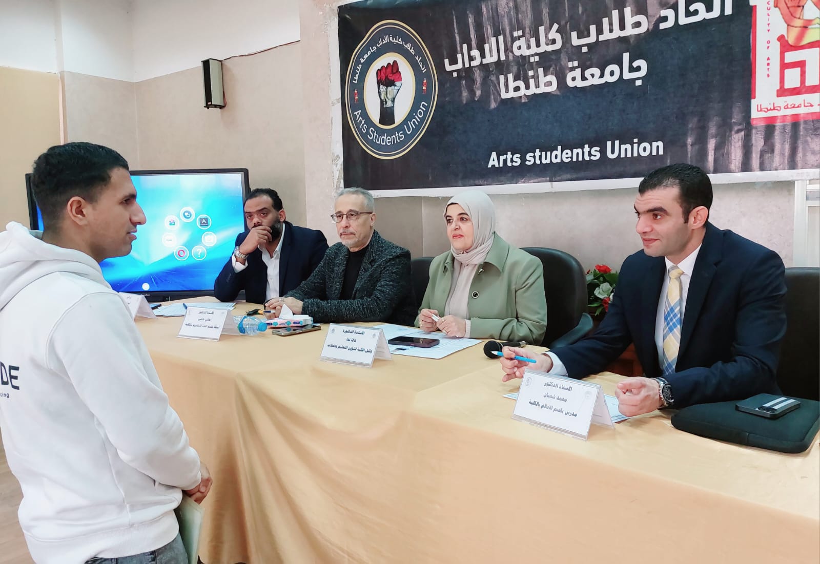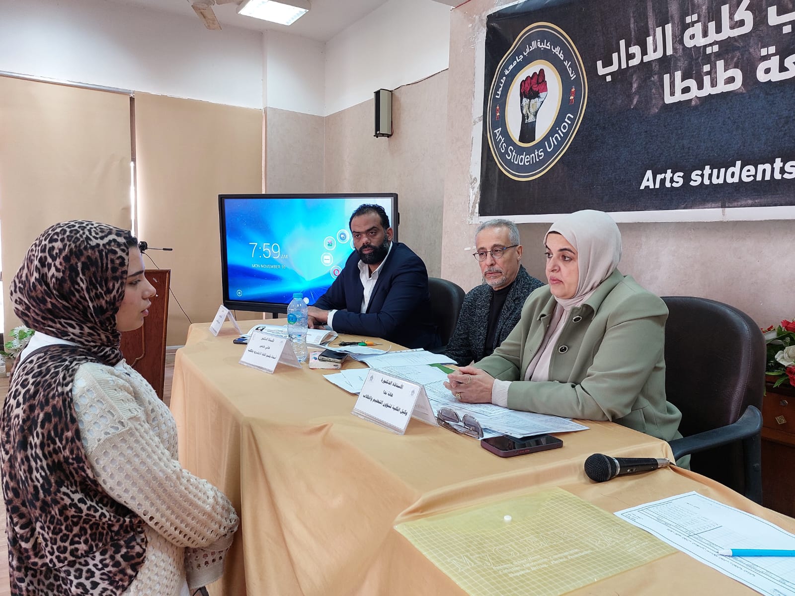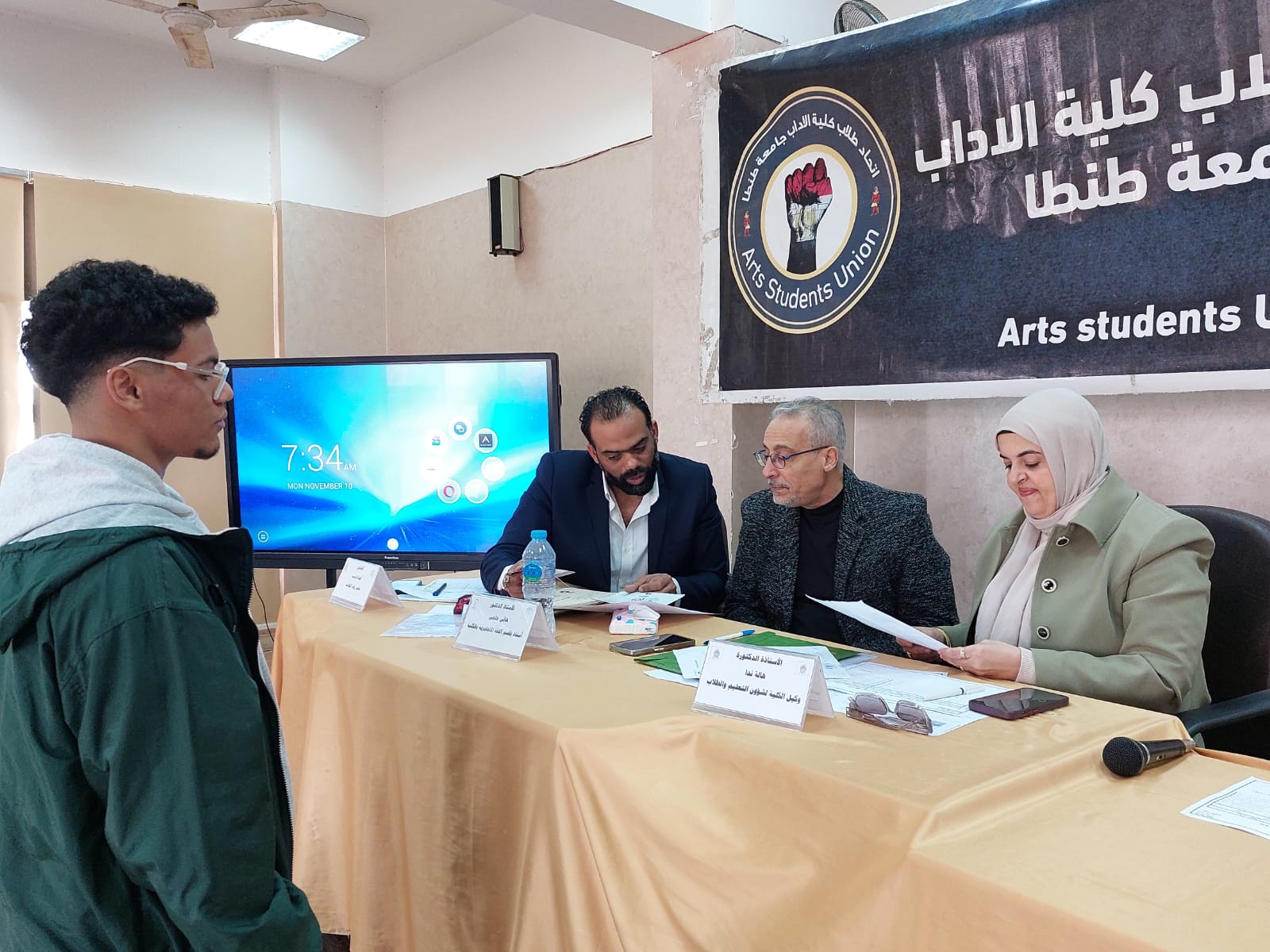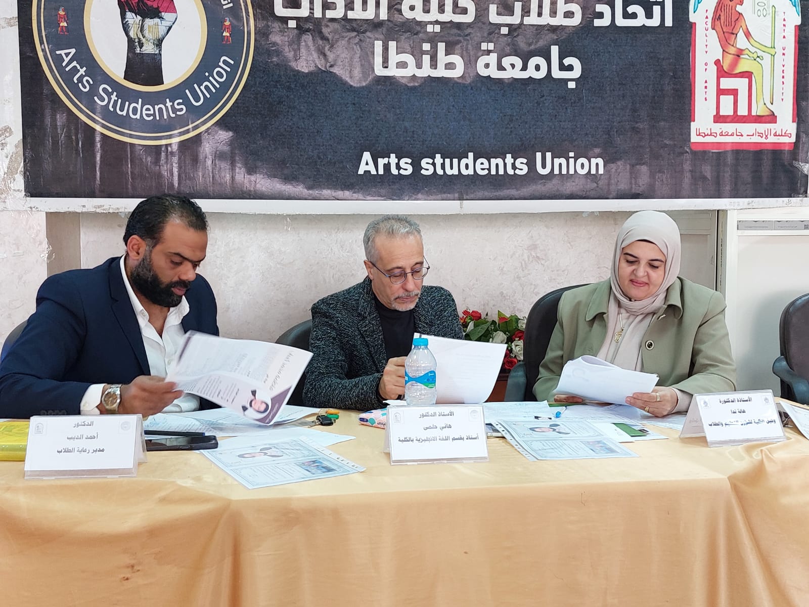 تحت رعاية السيد الأستاذ الدكتور/ أحمد عبادة العربي، عميد كلية الآداب بجامعة طنطا، وبحضور لجنة التحكيم التي ضمّت كلاً من الأستاذة الدكتورة/ هالة السيد ندا، وكيل الكلية لشؤون التعليم والطلاب، والأستاذ الدكتور/ هاني حلمي، الأستاذ بقسم اللغة الإنجليزية، والدكتور/ محمد شعبان العيسوي، المدرس بقسم الإعلام، وبمشاركة الأستاذ/ أحمد الديب، مدير إدارة رعاية الطلاب بالكلية، والأستاذة/ حنان سعد عطية، مسؤول اللجنة الاجتماعية بإدارة رعاية الطلاب.