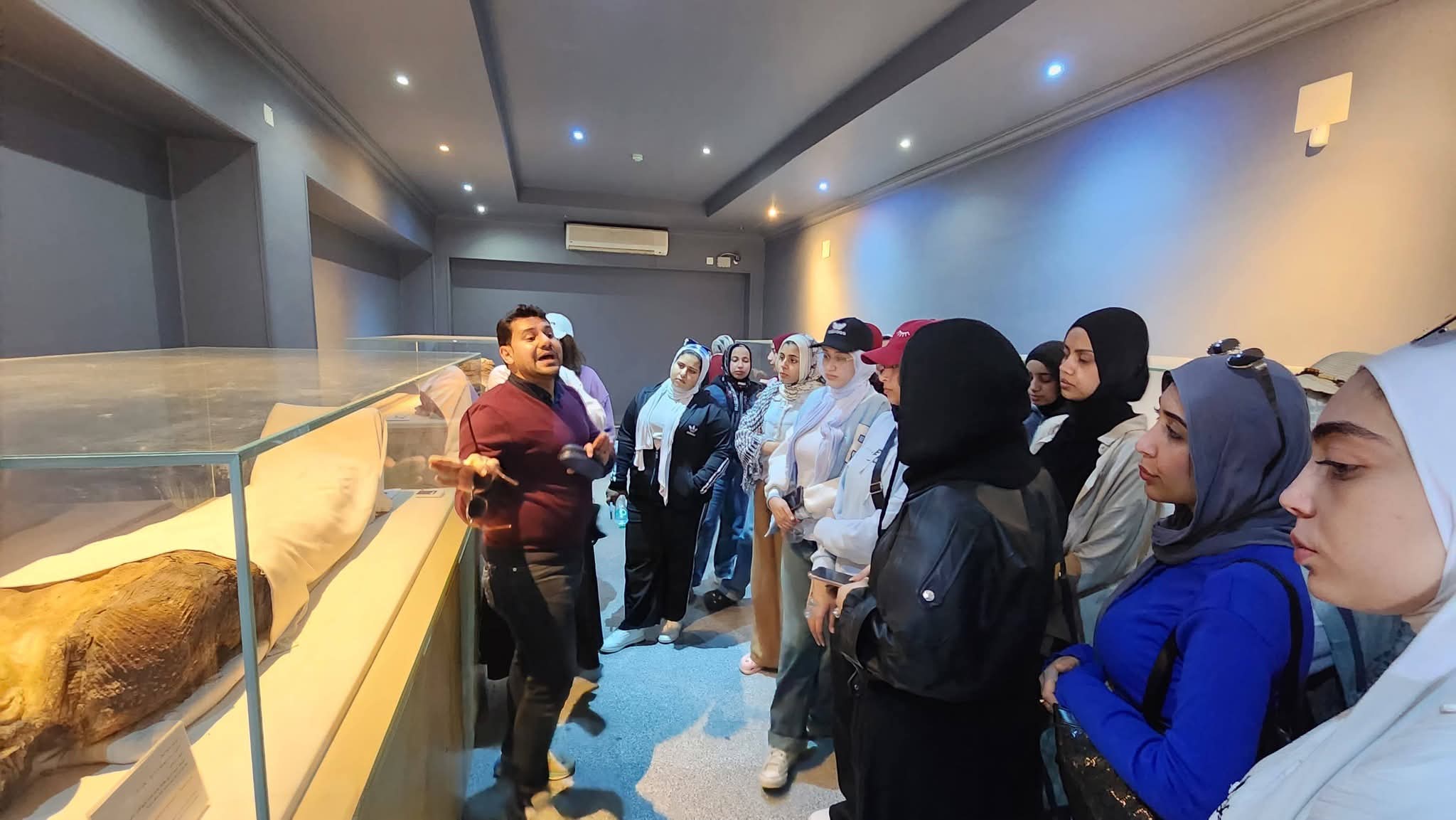 كما تضمنت الزيارة قاعة المومياوات الذهبية، حيث تم التعرف على أساليب العرض المتحفي وطرق حفظ وصيانة المومياوات، مما ساهم في تعزيز الفهم التطبيقي لعلم المتاحف.