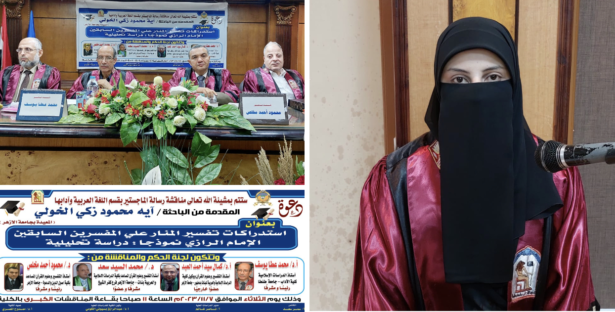 أقيمت بكلية الآداب جامعة طنطا مناقشة رسالة الماجستير بقسم اللغة العربية بالكلية والمقدمة من الباحثة "آيه محمود زكى الخولى" وذلك بعنوان "استدراكات تفسير المنار على المفسرين السابقين الإمام الرازى نموذجاً"(دراسة تحليلية).