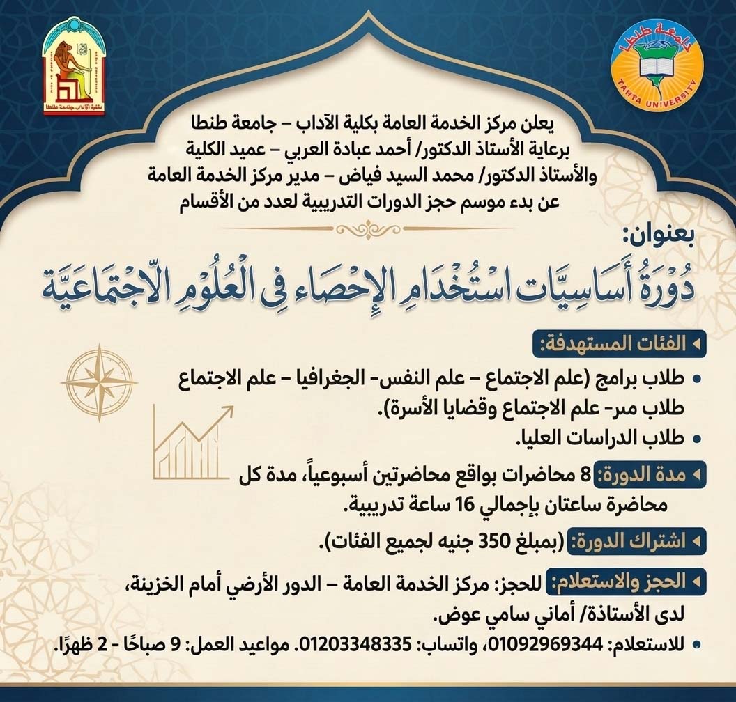 مركز الخدمة العامة بآداب طنطا يعلن عن دورة تدريبية بعنوان "أساسيات استخدام الإحصاء في العلوم الاجتماعية"