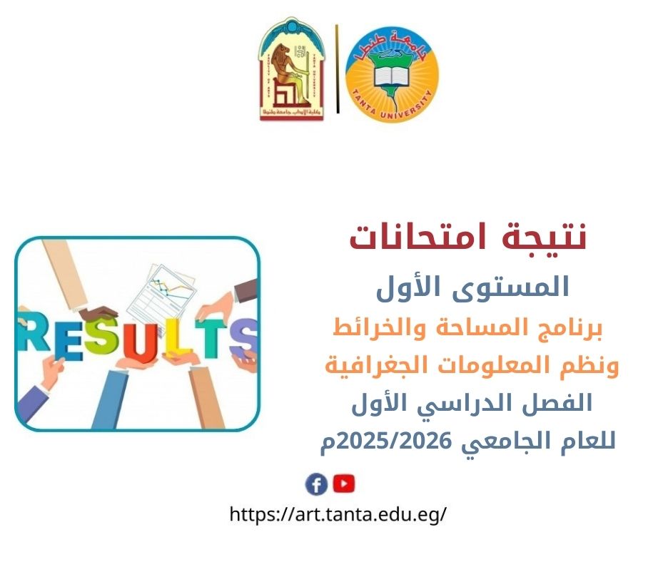 تعلن كلية الآداب بجامعة طنطا عن نتيجة امتحانات المستوى الأول برنامج المساحة والخرائط ونظم المعلومات الجغرافية الفصل الدراسي الأول للعام الجامعي 2025/2026م