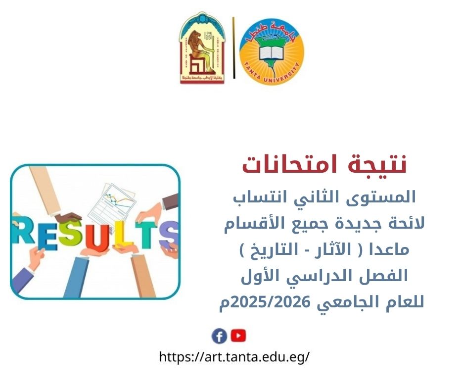 تعلن كلية الآداب بجامعة طنطا عن نتيجة امتحانات المستوى الثاني انتظام لائحة جديدة أقسام ( اللغة الإنجليزية - اللغة الفرنسية - التاريخ - علم النفس - الإعلام بشعبه - اللغات الشرقية بشعبها - دراسات المعلومات - الدراسات الفلسفية ) الفصل الدراسي الأول للعام الجامعي 2025/2026م