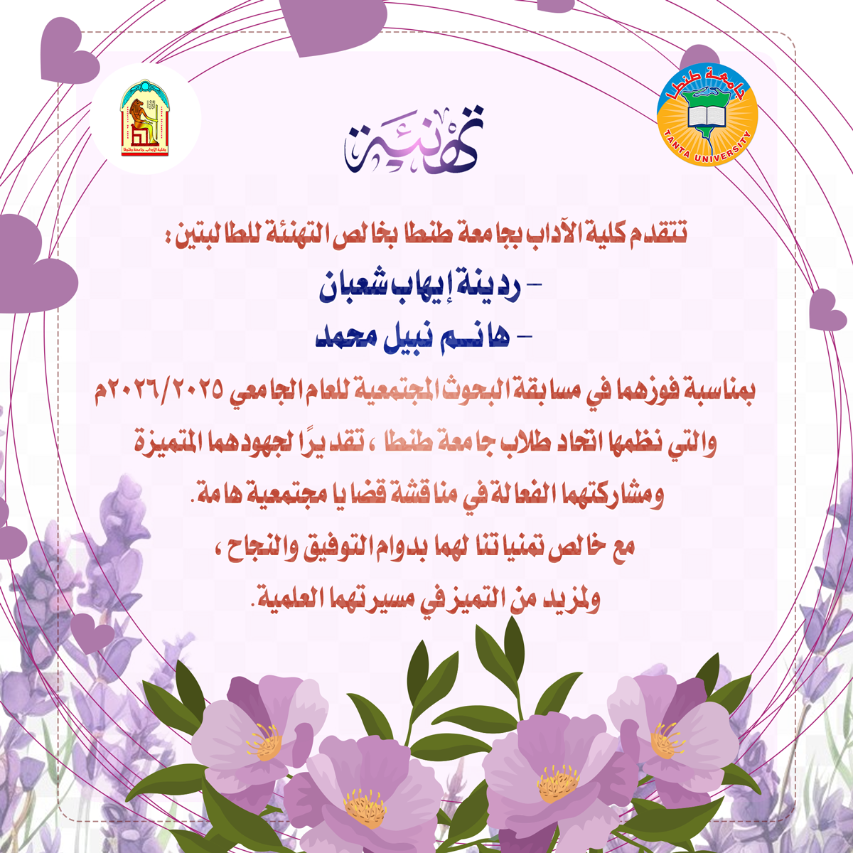 تتقدم كلية الآداب بجامعة طنطا بخالص التهنئة للطالبتين/ ردينة إيهاب شعبان، وهانم نبيل محمد، بمناسبة فوزهما في مسابقة البحوث المجتمعية