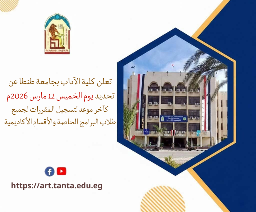 تعلن كلية الآداب بجامعة طنطا عن تحديد يوم الخميس الموافق 12 مارس 2026م كآخر موعد لتسجيل المقررات لجميع طلاب البرامج الخاصة والأقسام الأكاديمية، حيث سيتم إغلاق موقع التسجيل عقب هذا الموعد، ولن يُسمح بدخول امتحانات الميدتيرم للطلاب غير المسجلين